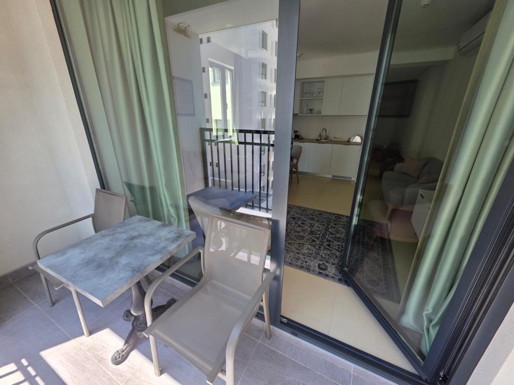 Структура: прихожая, ванная комната (душевая кабина, стиральная машина), гостиная с обеденной зоной, спальня, терраса. Апартамент находится в комплексе с бассейном, шезлонгами и ресепшном. Ориентирован на юг.